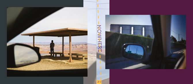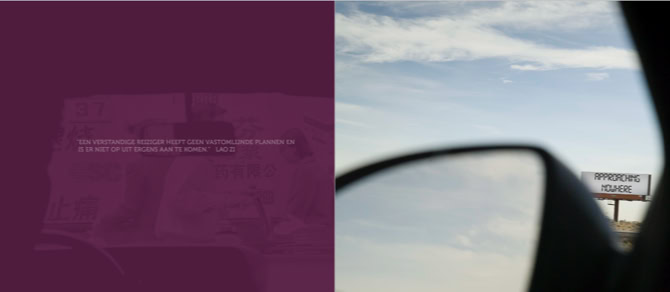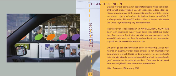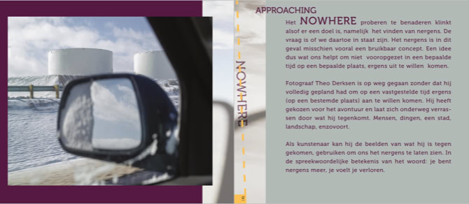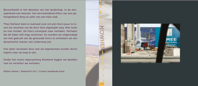 However, Theo Derksen chooses to show his photographs purely as a result of the route he has traveled. No more and no less. He brings the images together in a leporello. Originally a zigzag folded book, for the exhibition elaborated into an impressive installation. The photographs shown on it refer to stories. Stories that the viewer can come up with. For example, we are invited to embrace story telling using the photos shown as a dynamic way of being on the go. Let us be surprised by what we encounter without being immediately on the road. Under the motto Approaching Nowhere we capture images and tell stories