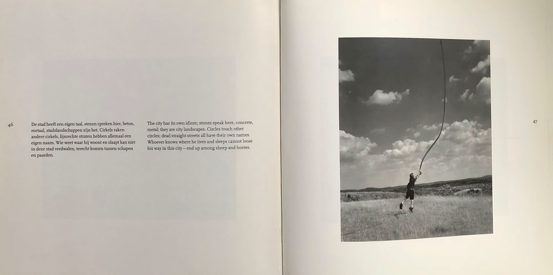 De stad heeft een eigen taal, stenen spreken hier, beton, metaal, stadslandschappen zijn het. Cirkels raken andere cirkels, lijnrechte straten hebben allemaal een naam. Wie weet waar hij woont en slaapt kan niet in deze stad verdwalen, terecht komen tussen schapen en paarden.