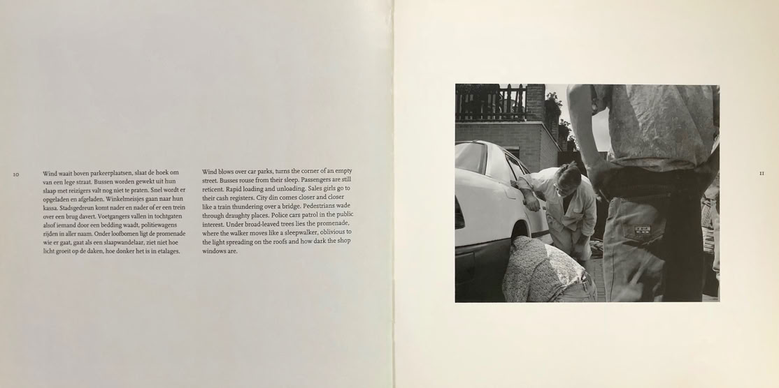 Snel wordt er opgeladen of afgeladen. Winkelmeisjes gaan naar hun kassa. Stadsgedreun komt nader en nader of er een trein over een brug davert. Voetgangers vallen in tochtgaten alsof iemand door een bedding waadt, politiewagens rijden in aller naam. Onder loofbomen ligt de promenade wie er gaat als slaapwandelaar, ziet niet hoe licht groeit op de daken, hoe donker het is in etalages.